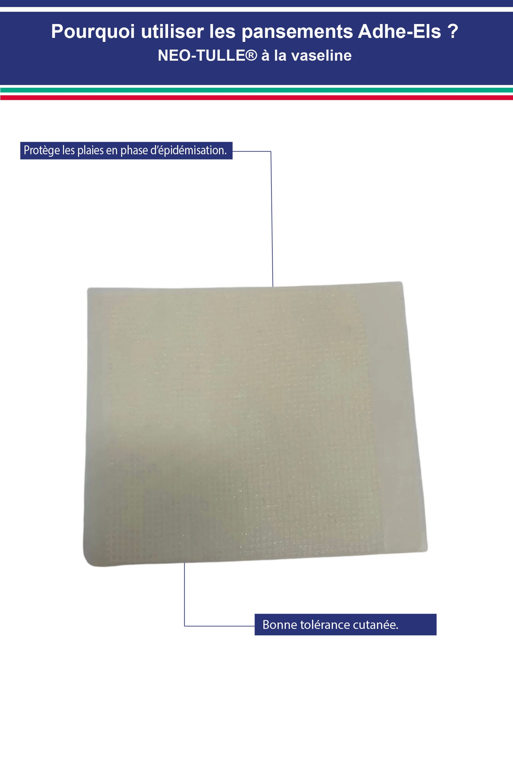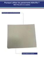 La compresse imprégnée à la vaseline NEO-TULLE® à la vaseline est un dispositif non invasif à usage à court terme destiné à maintenir un milieu humide suffisant et contrôlé pour la cicatrisation des plaies comportant une destruction du derme ou de la muqueuse, et ne pouvant se cicatriser que par deuxième intention sans provoquer une macération :