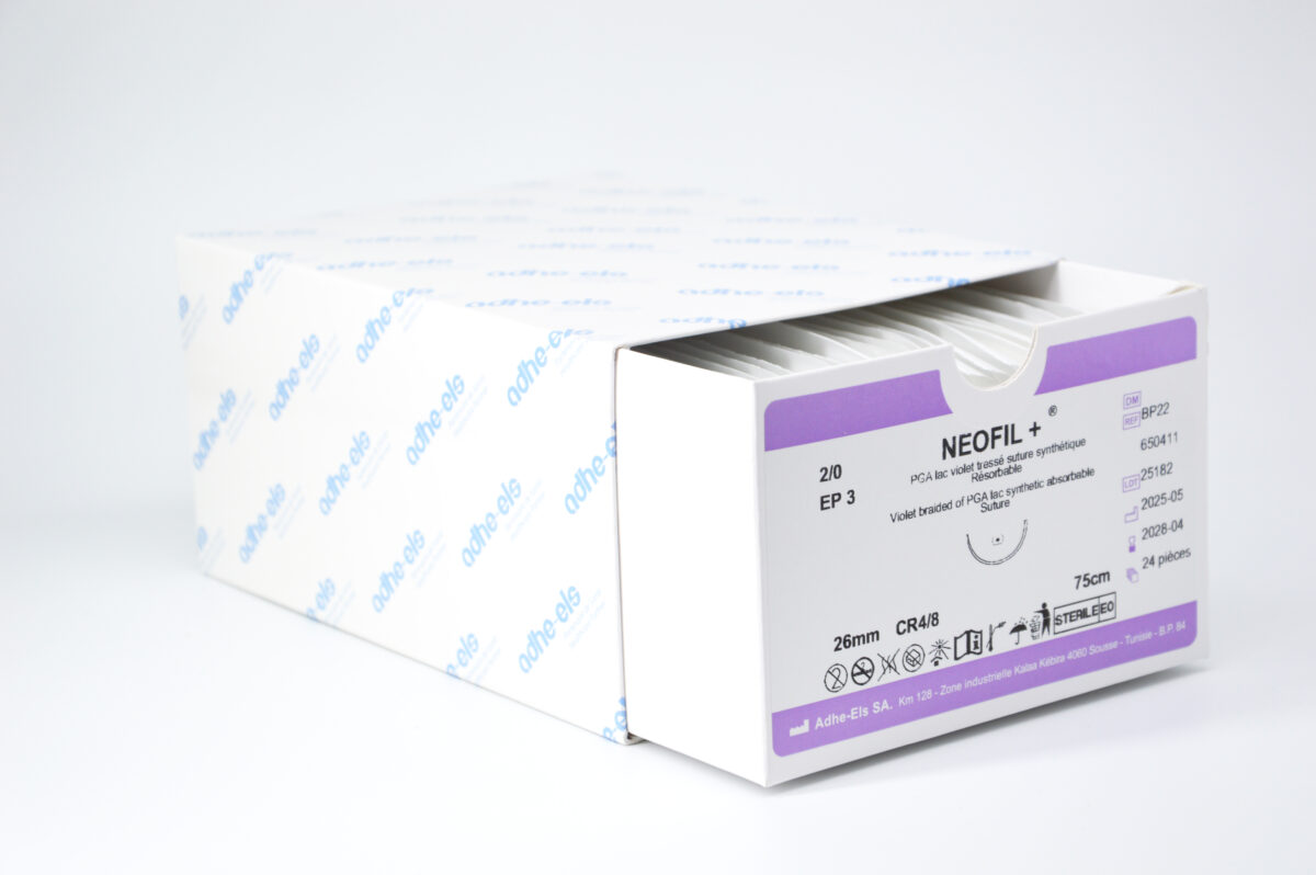 Les sutures synthétiques chirurgicales résorbables NEOFIL +® ANTIBACTERIEN sont conditionnées dans des boîtes de 24 unités.