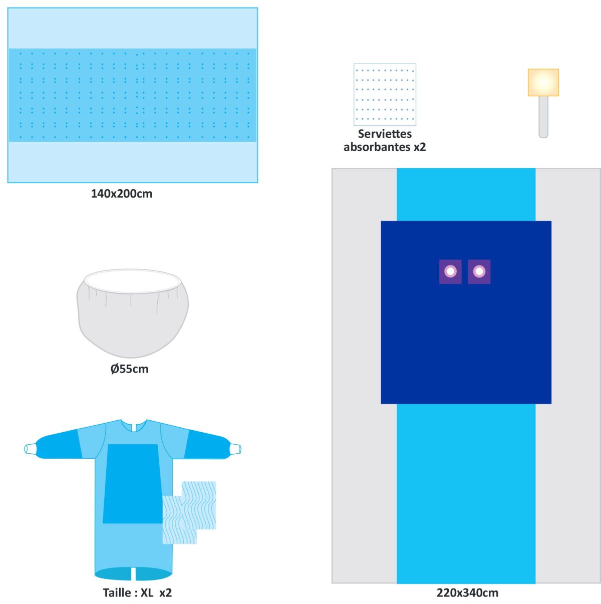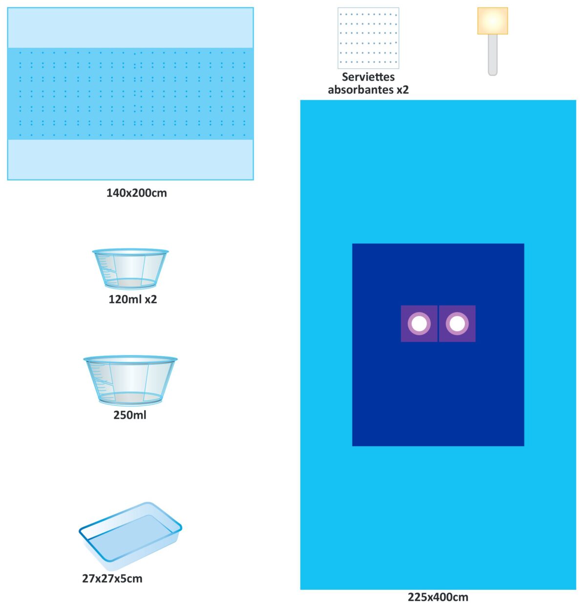 | 1 | Champ imperméable à 4 ouvertures (2 Radiales et 2 Fémorales) 220x340cm avec renfort et 2bandeaux transparents | ||||
