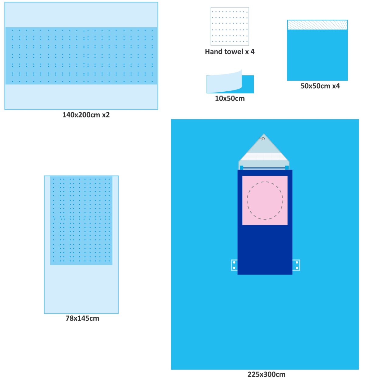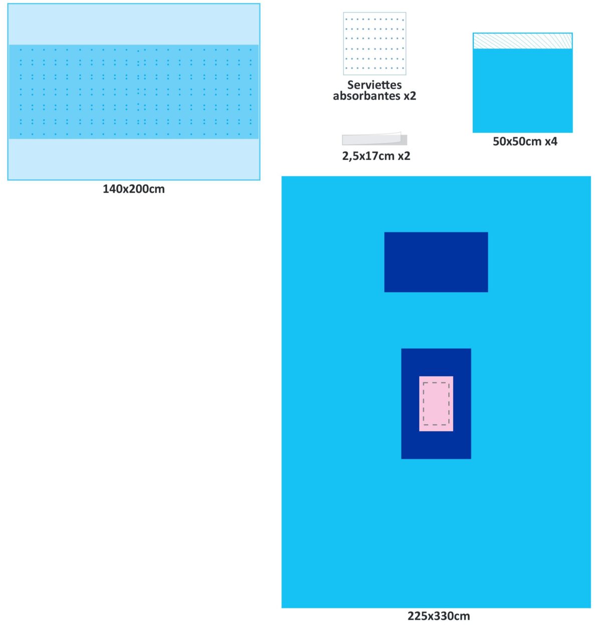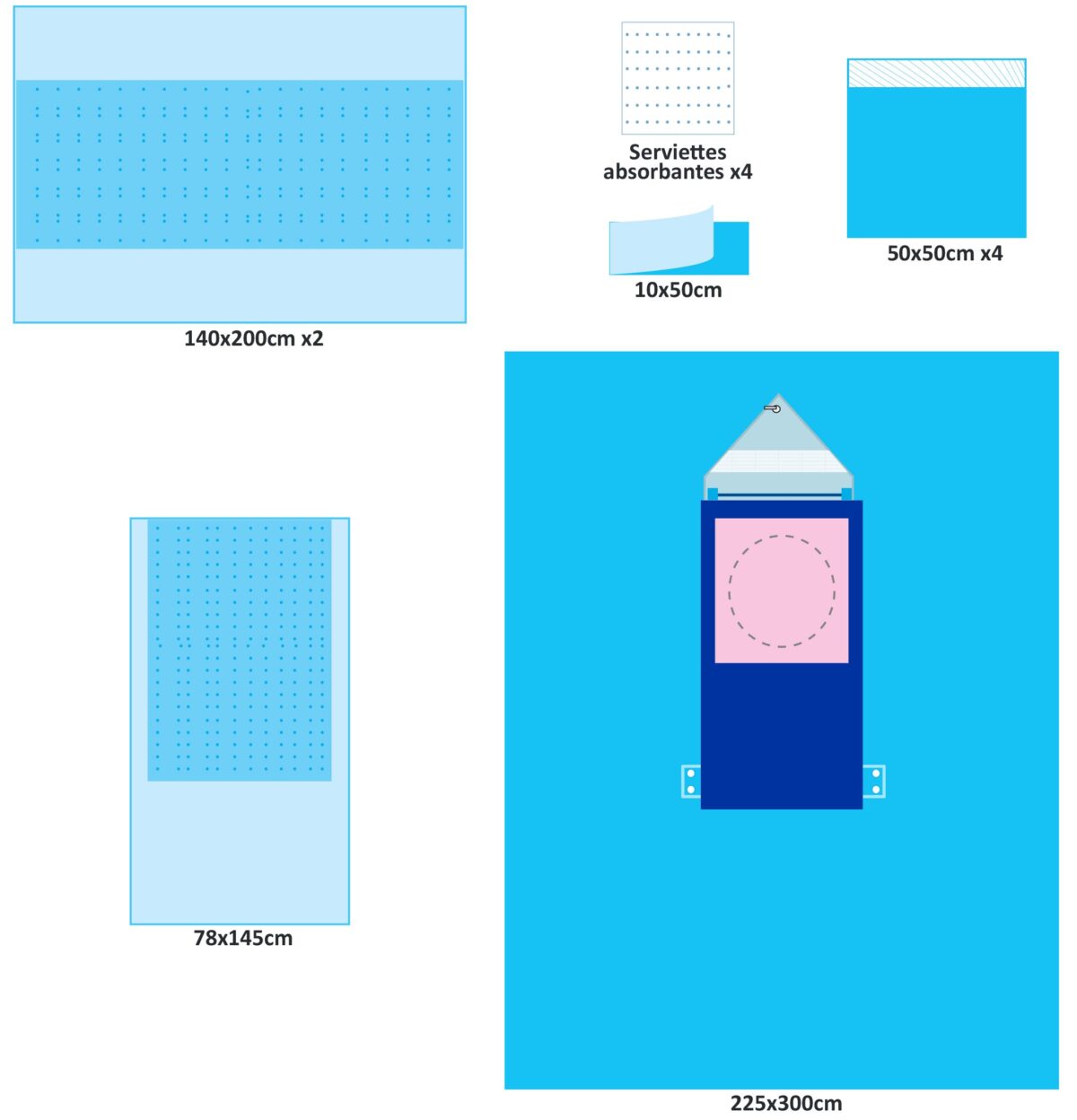 | 1 | Champ Craniotomie 225x300cm avec poche + film incision 40x50cm, ouverture 30cm | |||